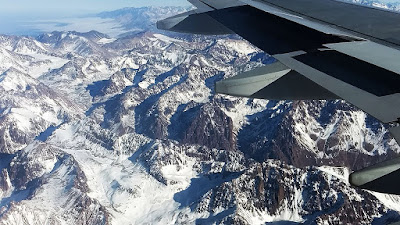 Estamos no rumo do território argentino e, nesse procedimento de subida, alguns itens extras de segurança são tomados, como manter os avisos de cintos de segurança ligados, comentar e seguir rigorosamente os procedimentos, em caso de uma despressurização ou falha em um dos motores, por exemplo, afinal estamos cruzando montanhas altíssimas, temos a segunda mais alta do mundo, o Aconcágua, 22.841 pés (6962 m), Cerro Colina 17.667 pés (5.353 m), Tupungato 21.555 pés (6.531 m), Maipo 17.270 pés (5.756 m) e, para completar a ideia, estamos ascendendo à 35.000 pés (10.606 m), mantendo velocidade de 300 nós (555 km/h).